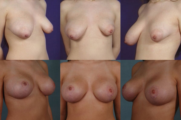 This patient presents with congenital/developmental asymmetry. Top photos show tuberous deformity with size asymmetry. A notoriously difficult condition to treat, these post-operative views demonstrate how bilateral breast lift (one side reduced) and implants create symmetry and pleasing breast shape.
