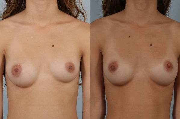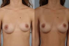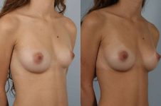 In this developmental anomaly, her left breast failed to completely develop. The difference between the two breasts were more than double the volume. I placed an implant and reconfigured the breast shape and position on the left which combined to give a near-perfect match. You can see in the mirror image views that after surgery, she is truly “mirror image”!