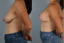 This patient presented with the challenge of uneven sagging breasts. The hallmark of my technique here is to reduce the breast volume as the lifting is done and simultaneously place an implant (under muscle). A great outcome.
