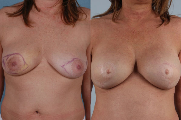 Shown prior to nipple reconstruction this patient underwent bilateral mastectomy (markings shown for mastectomy incisions dictated by mastectomy surgeon) and bilateral latissimus flap with implant reconstruction. A natural and soft reconstruction.