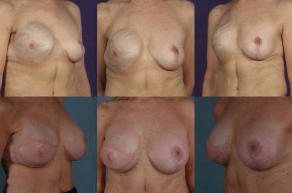 This woman presented having had attempts elsewhere at breast reconstruction after right mastectomy for breast cancer (top views). She had an implant reconstruction on the right and a breast lift on the left already done when I initially saw her. Her right side reconstruction was without shape, had profound hollowness and rippling (top right view) and was not a match to the left, either by volume, position or shape. The left side was poorly shaped and the nipple was too high (top left view).