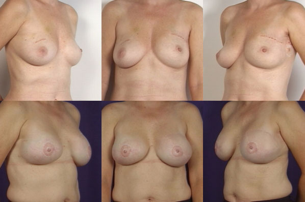 Bottom Photos (post-op): Bilateral mastectomy and bilateral reconstruction with latissimus flap and implant. Note how well scars have faded and how natural the nipple reconstruction appears.