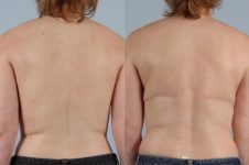 Here bilateral latissimus flaps and implants create a fine breast with no detectable breast scars. An amazing result after total mastectomy.