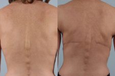 Here, bilateral mastectomy was combined with bilateral latissimus flaps and implants. Later, (after chemo and before radiation) nipple reconstruction was done. After recovery from radiation, the final pigmentation (tattooing) was done. A fine result.