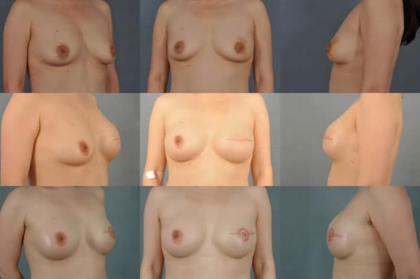 This patient presented for a unilateral left mastectomy and underwent reconstruction using a staged approach with tissue expanders (stage 1) followed by implant placement (stage 2). Augmentation of the right breast was done for symmetry and finally, nipple reconstruction was done (stage 3) to complete the process.