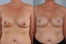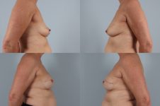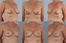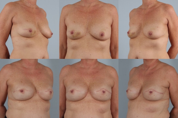 In order to improve the uneven sag in her breasts, when undergoing bilateral mastectomy, I designed her nipple sparing mastectomy and reconstruction using expanders and implants and ADM (acellular dermal matrix) to lift her during the reconstruction process. As the final stage, I did fat grafting to better camouflage the mastectomy. A great outcome.