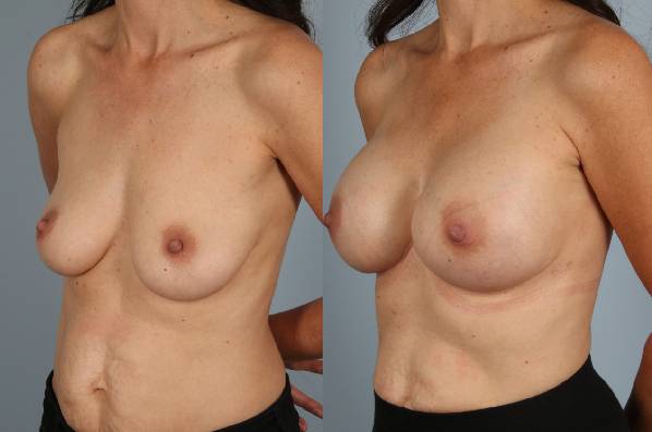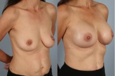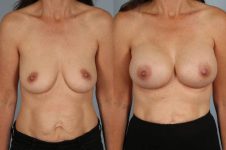 This patient underwent bilateral total mastectomy with staged implant and alloderm tissue grafting reconstruction. First stage tissue expander and sequential rapid air expansion allows for improved aesthetic shapes. All air is replaced by saline about 4 weeks after mastectomy. Subsequent second stage surgery to replace expander with implants and shape the space with lift and capsulectomy really refine the outcome. Ultimately the best cosmetic surgery breast outcome but in a mastectomy case is truly remarkable! A beautiful result.