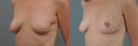 This case shows a patient after TRAM flap breast reconstruction for left mastectomy and post-surgery radiation. She developed severe radiation-induced atrophy and contracture.
