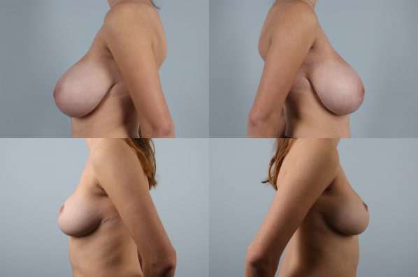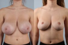 This young woman suffered from back, neck, and shoulder pains due to her extremely large breasts. She is shown after breast reduction from a HH cup to a small D cup. Months later, scars are barely visible. She has a great result and a new breast size and shape that fits her body well.