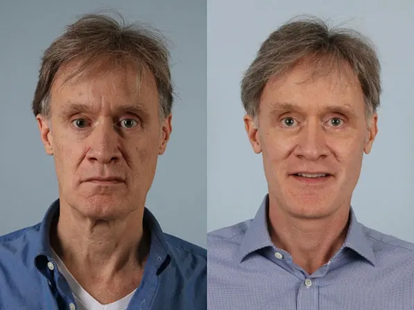This male presented with the typical aging features which prompt people to seek this procedure. I had previously (many earlier earlier) performed blepharoplasty (upper and lower). His face and neck aged around his youthful eyes with laxity, sag, and hollowness (loss of volume). I combined fat grafting (along jaw line, cheeks, lid cheek junction, brow ridge, and marionette folds) with SMAS composite face and neck lift.