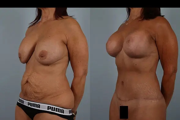 An amazing, total body transformation combining breast lift, capsulectomy, plus removal and replacement of implants. A total body lift including abdominoplasty was done along with diastasis repair, flankplasty, hip and buttock lift, liposuction of hips, and fat grafting of buttocks. The results transformed her body into a more youthful, beautiful figure!