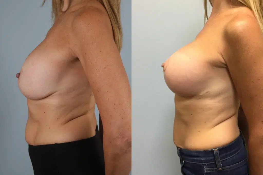 This patient presented with flat, wide breasts with sagging breast tissue down over the implants. In order to achieve the patient’s desired outcome of round, full, projecting breasts, I did total capsulectomy (removal of all implant related scar tissue), relifting and elimination of saggy breast tissue while placing a tissue graft sling (strattice) to hold the new implant position and enhance the roundness (like an internal bra). A great transformation.