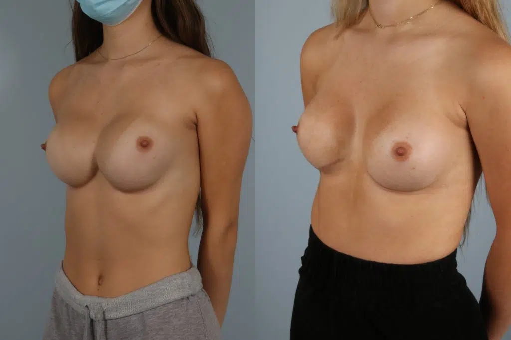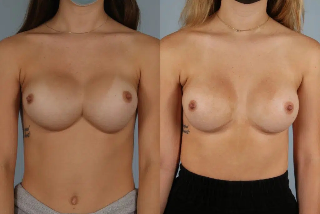 Correction of symmastia can be very challenging. It is often so severe that it created additional malposition of the nipples along with implant malposition. The solution here required total anterior and partial posterior capsulectomy (removal of scar tissue) in order to set the foundation for a new implant footprint. Then strattice graft is used to help create the new implant space. A more appropriate implant is chosen, and the overlying breast tissues are rotated over the top to reposition and recentralize the breast. An outstanding outcome.