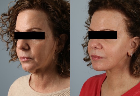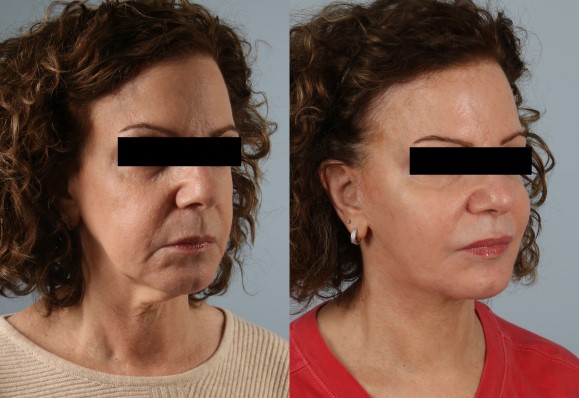 This patient presented with the challenges of dramatic neck laxity and jowling with laxity of deep tissues (SMAS and platysma). Additionally, I used my combination bilaminar (separating and treating skin and deep tissues distinctly SMAS Platysma Composite (in unison) elevation and tightening of neck platysma centrally laterally as well as facial SMAS and its superior fibrofatty extension with multivector repositioning to yield long lasting significant (yet natural appearing) improvements to the face. A great representative result of my version of a deeper plane face lift.