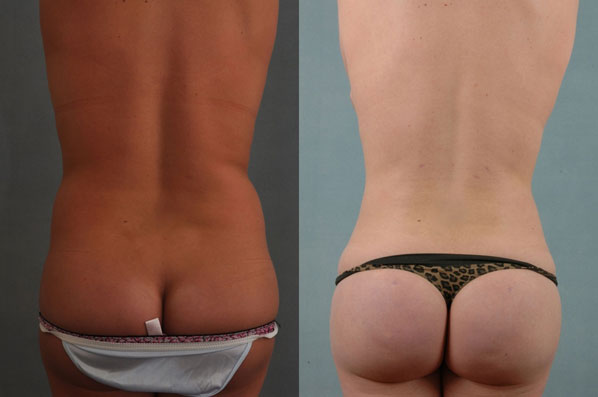 I performed liposuction of the entire torso, including the back, hips, lateral buttock, flanks, abdomen, and ribs (along with a breast lift and the removal of implants). The result is a remarkable transformation. Note the buttocks shape and lifting.