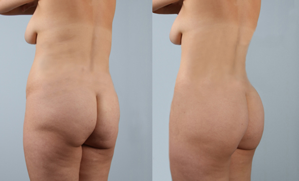 Liposuction of hips, back, and upper buttock, combined with fat grafting of lower and central buttock artistically create a more pleasing shape.