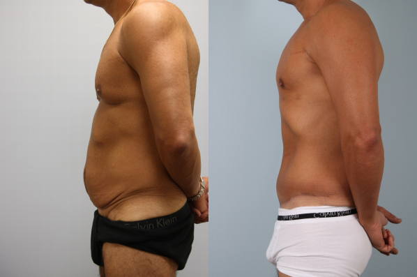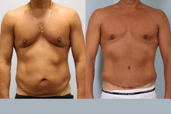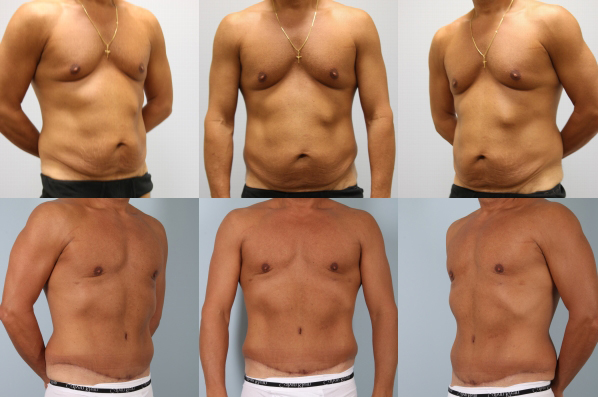 This patient underwent a combination male breast reduction (gynecomastia), while also undergoing abdominoplasty and flankplasty procedures. The transformation restores his body back to a fit youthful form.